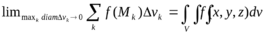 Теорема существования. Пусть область V и функция f(M)=f(x, y, z) удовлетворяют сформулированным требованиям. Тогда тройной интеграл существует как предел интегральных сумм.