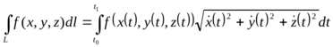Параметризуем дугу L: AB x = x(t), y = y(t), z =z (t). Пусть t0 соответствует точке A, а t1 соответствует точке B. Тогда криволинейный интеграл первого рода сводится к определенному интегралу (