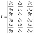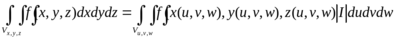 Теорема. Пусть с помощью непрерывных функций x = x(u, v, w), y = y(u, v, w), z =z(u, v, w) имеющих непрерывные частные производные установлено взаимно однозначное соответствие пространственно односвязных ограниченных, замкнутых областей Dxyz, Duvw с кусочно-гладкой границей. Тогда
