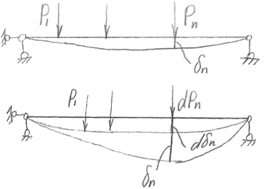 Изменим теперь порядок приложения сил. Приложим сначала к упругому телу силу dPn. В точке приложения этой силы возникнет соответственно малое перемещение, проекция которого на направление силы dPn равна. dδn. Тогда работа силы dPn оказывается равной dPn· dδn /2. Теперь приложим всю систему внешних сил. При отсутствии силы dPn потенциальная энергия системы снова приняла бы значение U. Но теперь эта энергия изменится на величину дополнительной работы dPn·δn которую совершит сила dPn на перемещении δn , вызванном всей системой внешних сил. Величина δn опять представляет собой проекцию полного перемещения на направление силы Рn.