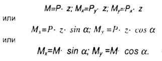| При косом изгибе действующие внешние силы (моменты) представляют их проекциями на главные оси поперечного сечения (рис. 7.1, б), тем самым сводят задачу к случаю поперечного изгиба в двух главных плоскостях. Из рис. 7.1, а, б видно, что: |