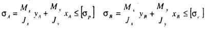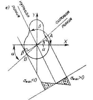 | Максимальные по величине напряжения растяжения возникают в точке А с координатами Xa, Yл, а максимальные напряжения сжатия возникают в точке В с координатами XВ, YВ (рис. 7.1, в): |