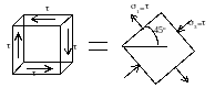 , где F — сила, действующая вдоль грани, А — площадь грани. Площадки, по которым действуют только касательные напряжения, называются площадками чистого сдвига. Касательные напряжения на них — наибольшие. Чистый сдвиг можно представить как одновременное сжатие и растяжение, происходящее по двум взаимно перпендикулярным направлениям. Т.е. это частный случай плоского напряженного состояния, при котором главные напряжения: 1= — 3 = ; 2= 0. Главные площадки составляют с площадками чистого сдвига угол 45о.