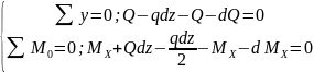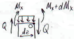 Пусть стержень закреплён произвольным образом и нагружен распределённой нагрузкой q. Выделим из стержня эл-т длинной dz и в проведённых сечениях приложим моменты Мx и Мx+dMx, а также поперечные силы Q и Q+dQ. Запишем ур-ие равновесия и ур-ие моментов отн. т. О: