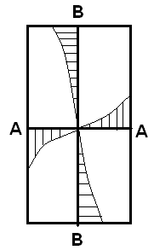 а рисунке показана полученная методом теории упругости эпюра касательных напряжений для бруса прямоугольного сечения. В углах, как мы видим, напряжения равны нулю. Наибольшие напряжения возникают по серединам больших сторон, в точках А:
