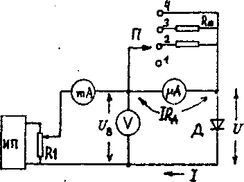 прощенная схема, в которой не показаны переключатели, дана на рис. Диод Д (кремниевый или германиевый) через резистор R подключен к источнику постоянного напряжения (ИП), изменяемого от 0 до 15 В. Переменный резистор R1 также используется для изменения напряжения на диоде. Цифровым вольтметром с большим сопротивлением измеряют напряжения U на диоде и Ur на известном сопротивлении R для вычисления тока I=Ur/R. Для измерения малых токов устанавливают большое сопротивление.