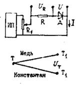 Два диода, нагреватель и один спай термопары плотно закреплены на металлической пластине, расположенной в камере с крышкой. Для опытов со светом защитная оболочка кремниевого диода удалена, и при открытой крышке р-п -переход можно осветить лампой. Для измерения температуры диодов служит термопара. Она состоит из двух металлических проводников - медного и константанового (специальный сплав), спай которых находится в тепловом контакте с диодами при измеряемой температуре Т. Другие концы проводов соединены с вольтметром, они имеют комнатную температуру T1 - 295 К. Когда температуры Т и Т1 различны, в цепи возникает термоЭДС UT, пропорциональная разности температур и измеряемая вольтметром. Температуру диодов в Кельвинах можно вычислить по формуле