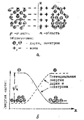В монокристалле можно создать резкий переход от полупроводника n-типа к полупроводнику p-типа. На рисунке левая от линии ММ часть кристалла, p-типа, содержит основные -носители - дырки, примерно такое же количество отрицательных акцепторных ионов и незначительное количество электронов. Правая часть, n-типа, содержит соответственно электроны проводимости (основные носители), положительные донорные ионы и небольшое количество дырок.
