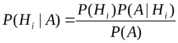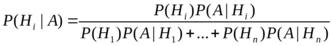 Пусть для некоторого события A, P(A)>0, и гипотез H1, …, Hn известны P(H1), …, P(Hn) (P(Hi)>0, i=1…n) и P(A|H1), …, P(A|Hn). Тогда условная вероятность P(Hi|A), i=1…n, гипотезы Hi при условии события A определяется формулой Байеса: .