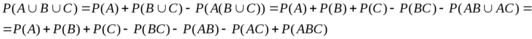 Поскольку , то, согласно расширенной аксиоме сложения, , откуда с учетом аксиомы нормированности получаем утв. 1. Утв. 2 вытекает из равенства A = A + и расширенной аксиомы сложения. Пусть . Тогда B = A + (B\A). В соответствии с расширенной аксиомой сложения P(B) = P(A) + P(B\A). Отсюда и из аксиомы неотриц. приходим к утв. 3. В частности, так как всегда , то с учетом аксиомы неотриц. получаем утв. 4. Поскольку , , то, используя расширенную аксиому сложения, находим и . Подставляя в первое из последних двух равенств вероятность P(B\A), выраженную из второго равенства, приходим к утв. 5. Утв. 6 можно доказать с помощью метода матем. индукции. Так, для трех событий A, B и С: