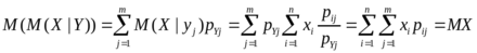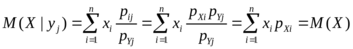 Условным математическим ожиданием M(X|Y) дискретной случайной величины X относительно дискретной случайной величины Y называют функцию M(X|Y) = g(Y) от случайной величины Y, где область определения функции g(y) совпадает с множеством значений y1, …, ym случайной величины Y, а каждому значению yj аргумента y поставлено в соответствие число g(yj) = M(X|yj). Для непрерывной величины