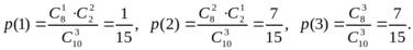 Пример 1. Найдем математическое ожидание случайной величины Х – числа стандартных деталей среди трех, отобранных из партии в 10 деталей, среди которых 2 бракованных. Составим ряд распределения для Х. Из условия задачи следует, что Х может принимать значения 1, 2, 3.
