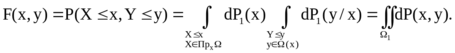 где Прx - проекция множества на ось x, (x) - сечение множества некоторой прямой х=const. Все пять введенных мер Р(х,у), Р1(х), P2(у), Р1(х/у) и Р2(у/х) являются вероятностными мерами. Меры Р1(х) и P2(y) называются маргинальными (проекциями мер Р на оси х и у), а меры Р1(х/у) и Р2(у/х) - условными мерами. Соответствующие этим мерам функции распределения вероятностей называются соответственна маргинальными и условными распределениями. Нетрудно основываясь на одной из трех приведенных форм интегрального представ ления вероятности, определить функции распределения F(x)= P(X x) и F(у)= Р(У у) или же функцию распределения F(х,у) = Р(Х х, Y у). Приведем, например, одно из возможных представлений для функции распределения F(х,у):