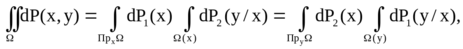 Пусть на множестве R2 координатные величины Х и Y являются случайными. Их распределение нa задается вероятностной мерой Р, определенной на алгебре подмножеств множества . Вероятностная мера Р на множестве , может быть записана в виде одного из следующих, равных друг другу интегралов: