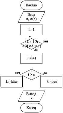 Эту задачу можно решить, например, если последовательно сравнить каждый элемент массива с последующим. Так как рассматриваются все элементы, то одно условие – это достижение конца массива, а другое – обнаружение двух одинаковых соседних элементов. Схему алгоритма для решения этой задачи см. на рисунке 3.14.