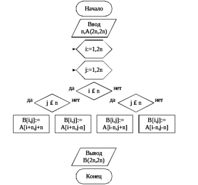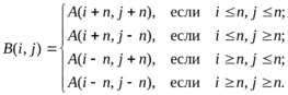 Для решения этой задачи нужно определить правило, по которому будут преобразовываться индексы матрицы. Будем считать, что после преобразования получается новая квадратная матрица размерности 2n. Тогда внимательно изучив соответствие между элементами матрицы A и матрицы B, получаем следующий закон преобразования: