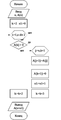 Пример 3.8. Предположим, нам необходимо переформировать массив вещественных чисел, добавив в него нулевые элементы после положительных элементов, стоящих на четных местах.