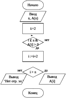 Пример 3.11. Необходимо определить среди элементов, стоящих на четных местах первый отрицательный элемент.