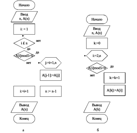 просматривая массив, будем переписывать все остающиеся элементы на очередное место. В этом случае потребуется две переменные индекса: в качестве первой будем использовать переменную цикла, а вторую будем менять независимо после записи очередного остающегося элемента (см. рисунок 3.11, б).