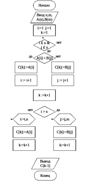 Рисунок 3.13 – Схема алгоритма слияния сортированных массивов