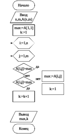 Для решения этой задачи нужно организовать цикл для перебора всех элементов матрицы. Так как матрица является двумерным массивом, то потребуется два цикла (один для перебора строк, второй – столбцов). В остальном, алгоритм решения этой задачи (см. рисунок 3.16) схож с алгоритмом нахождения максимального элемента одномерного массива.