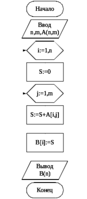 Для вычисления суммы элементов некоторой строки с номером i необходимо организовать цикл для перебора всех элементов данной строки. Поэтому параметром этого цикла следует выбрать номер столбца j. Перед циклом с параметром j необходимо задать начальное значение суммы S=0. После окончания цикла результат присваивается соответствующему элементу массива b. Для обеспечения обхода всех строк матрицы параметром внешнего цикла следует выбрать номер строки i (см. рисунок 3.17).