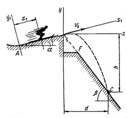 Лыжник подходит к точке A участка трамплина AB, наклонённого под углом α к горизонту и имеющего длину l, со скоростью VA. Коэффициент трения скольжения лыж на участке AB равен f. Лыжник от точки A до точки B движется τ с. В точке B со скоростью VB он покидает трамплин. Через T с. лыжник приземляется со скоростью VC в точке C горы, составляющей угол β с горизонтом.