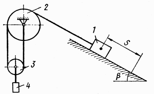 Механическая система под действием сил тяжести приходит в движение из состояния покоя; начальное положение системы показано на рис. 1. Учитывая трение скольжения тела 1, пренебрегая другими силами сопротивления и массами нитей, предполагаемых нерастяжимыми, определить скорость тела 1 в тот момент, когда пройденный им путь станет равным s.