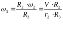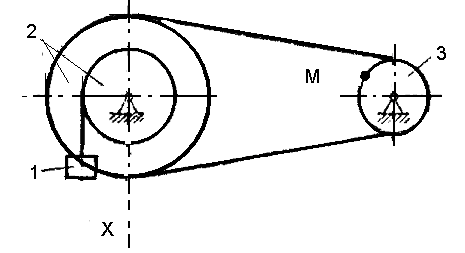 Для определения скорости и ускорения точки М запишем уравнения, связывающие скорость груза V и угловые скорости колес