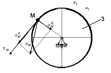 Скорость точки М, ее вращательное, центростремительное и полное ускорения определяются по формулам: