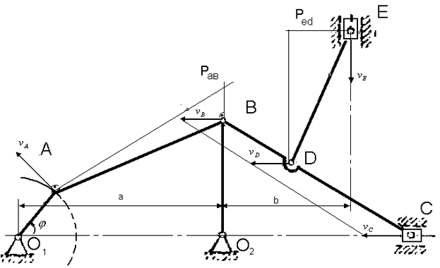 Мгновенный центр скоростей РАВ звена АВ находится на как точка пересечения перпендикуляров, проведенных из точек А и В к их скоростям. Аналогично определяется положение мгновенного центра скоростей РDE. Мгновенный центр скоростей звена АВ находится в бесконечности.