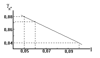 Cогласно уравнению при полном распаде на ионы концентрация ионов SO42- составит 0,02 моль/л, а концентрация ионов Н+ - в 2 раза больше, то есть 0,04 моль/л . Для расчета рН следует определить активность ионов Н+ в данном растворе : а Н+= H+ СH+ . Коэффициент активности найдем по правилу ионной силы из табл. 2.. Ионная сила раствора : I = 1/2 ( 0,02 . 22 + 0,04 . 1 ) = 0,06 . В табл.2 имеются данные для H+ при I = 0,05 и I = 0,1 . Коэффициент активности для I = 0,06 найдем методом интерполяции , допуская линейную зависимость от I в данном интервале ( см. график ) . Итак , для I = 0,06 = 0,872 . Искомое значение рН = - lg a H+ = - lg 0,872 . 0,04 = 1,46 .