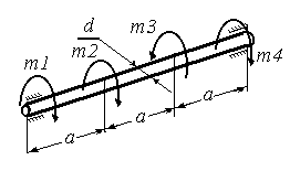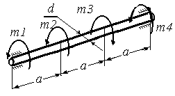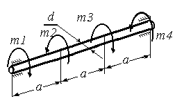 | Построить эпюру Mz(z), определить диаметр вала из условий прочности и жесткости. m1=0.3 КНм, m2=0.5 КНм, m3=0.5 КНм, m4=0.3КНм, G=0.8*1011Па, [τ]=40МПа, [θ]=0.5 *10-2 рад/м. | |||
