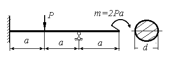 | Определить диаметр из условия прочности, а = 1м, P = 25 кН, [n] = 1.5, материал балки - ст.3. | |||