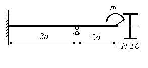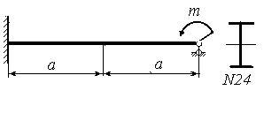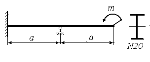 | Проверить прочность балки, а = 2.5 м, m = 30 кНм, [n] = 2, σТ = 300 МПа. | |||