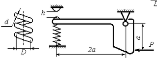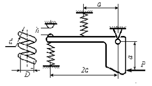 | Для перекрытия зазора h необходимо приложить усилие Р. Из условия прочности и условия ограничения перемещения h подобрать параметры пружин d, D, n, если индекс пружин D/d = 8. [τ] = const. Обе пружины одинаковые. | |||