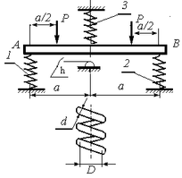 | Недеформируемый элемент AB удерживается тремя пружинами: D1=D2=8 см, d1=d2=12мм, n1=n2= 8, D3=12 см, d3=15 мм, n3=10, a=75 см. Из условия прочности и ограничения перемещения h определить допускаемую нагрузку [q], [τ] = 300 МПа, h = 8 мм. | |||