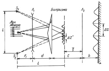 . Теперь это излучение нужно разбить на две волны, которые и дадут интерференционную картину. Для этого пучок света, вышедший из линзы, направляют на грани бипризмы Френеля. Преломляясь на каждой из них, он выходит в виде двух пучков света, создавая иллюзию того, что они исходят как бы из двух самостоятельных точечных источниках света