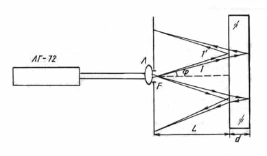 Параллельный пучок света от гелий-неонового лазера (ЛГ-72), падающий на короткофокусную линзу Л, собирается в ее фокусе F, положение которого совпадает с центром отверстия в экране Э. Далее расходящийся лазерный пучок падает на плоскопараллельную пластинку и, отражаясь от ее передней и задней поверхностей, образует на экране Э интерференционную картину в виде концентрических колец. Наклон пластинки можно менять с помощью юстировочных винтов.