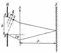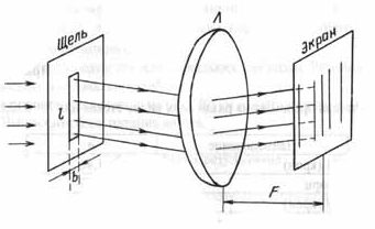 много больше ее ширины b. Лучи, прошедшие через щель, попадают на собирающую линзу, которая формирует на экране дифракционную картину в виде системы полос параллельных щели. Экран расположен в фокальной плоскости линзы. Это и позволяет моделировать дифракцию параллельных лучей на бесконечно удаленном экране. Так как щель длинная, то картина, наблюдаемая в любой плоскости, перпендикулярной щели, будет одинакова. Поэтому достаточно исследовать характер этой картины в одной из плоскостей, например в плоскости рис. 8.2.