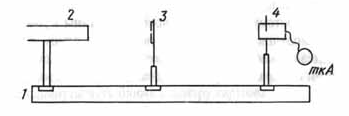 На оптической скамье (1) установлены: гелий-неоновый лазер (2); рейтер с пластинкой (3) и фотоприемник (4) с достаточно узким входным окном. На одном участке пластинки (3) имеется одна щель, а на другом - две. Щели выполнены в виде одной и двух рисок, нанесенных алмазом на стекле. Поперечным перемещением их можно вводить в зону лазерного луча. Фотоприемник соединен с микроамперметром и может с помощью микрометрического винта перемещаться в плоскости дифракционной картины, что позволяет использовать распределение интенсивности света в дифракционном спектре. Для упрощения оптической схемы за щелями нет линзы для фокусировки дифракционной картины, поэтому в случае двух щелей она представляет собой не узкие спектральные линии, а широкие полосы, повторяющие сечение лазерного пучка.