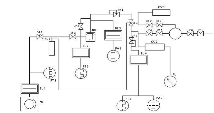 PL – компрессорный манометр; CV – баллоны; VF – краны;