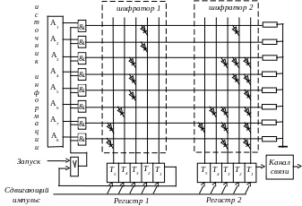 Устройство включает схему поучения моментов считывания очередной буквы (матричный шифратор 1 с регистром сдвига 1) и шифратор букв (матричный шифратор 2 с регистром сдвига 2). Число горизонтальных шин шифраторов равно числу кодируемых букв, а число вертикальных шин в каждом из них равно числу символов в самой длинной комбинации используемого кода. Схема рассчитана на использование алфавита из 8 букв (сообщений). Источник информации удовлетворяет требованиям идеального источника по Хартли, т.е. в каждый данный момент он возбуждает шину только одной буквы, выставляя на нее сигнал "1". В регистре 1 появляется сигнал "1" в разряде соответствующем длине кодовой комбинации буквы, что обеспечивается диодным переходом. В регистре 2 появляется код соответствующий букве, шина которой возбуждена. Что тоже обеспечивается соответствующими диодными переходами с возбужденной шины на триггеры регистра 2. Сдвигающими импульсами код буквы последовательно выталкивается в канал связи, а единица "вытолкнутая" из регистра 1 разрешает источнику выдать очередную букву.
