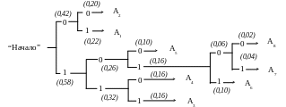 2. По конкретным значениям вероятностей встречаемости букв, заданных студенту преподавателем или выбранно самостоятельно (отличающихся от рассмотренного в описании, не более 8 букв и нетривиальный случай), построить эффективный код, используя методики Шеннона-Фено и Хаффмена.