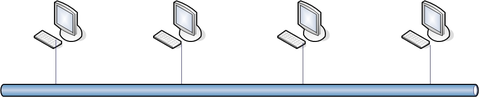 Топология типа шина (рис.1), представляет собой общий кабель (называемый шина или магистраль), к которому подсоединены все рабочие станции. На концах кабеля находятся терминаторы, для предотвращения отражения сигнала.