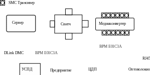 Для построения сети необходимо установить в ЦДП свитч, сигнал из него идёт свитчу, затем от свитча три кабеля на медиаконвертеры (шасси для медиаконвертеров) SMC. В шасси вставляются трансиверы, которые переводят сигнал из 1000Base-T в 1000Base-LX то есть электрические импульсы на витой паре в световые импульсы на оптоволоконном кабеле. Все оптоволоконные кабеля проходят через ВРМ E01C3A и за ним упаковываются в одну оболочку по двое – на предприятие. На предприятии через ВРМ JXP-C проходит кабель, и идёт в трансивер Dlink, который переводит обратно световые импульсы в электрические. К трансиверу через патч-корд RJ-45 подключается УСПД.