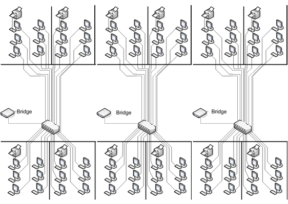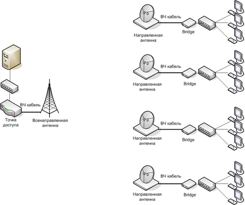 Сегмент сети в пределах одного здания реализуем средствами 1000BASE-TX. На этаже будут располагаться 3 коммутатора Intel Express 510T (24 порта, пропускная способность до 100 Мбит/с), один на 24 компьютера. При этом объём данных через коммутатор не будет превышать 48 Мбит/c. Кроме того потребуется 1081 патч-корд UTP 5 м для каждого компьютера сервера. К коммутатору сервера присоединяем точку доступа со всенаправленной антенной. Коммутаторы, расположенные в зданиях, соединяются с мостами (bridge), мосты соединяются с направленными антеннами высокочастотным кабелем.