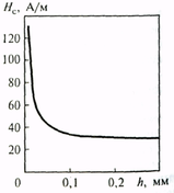 Коэрцитивная сила Нс является важной технической характеристикой магнитных материалов и как магнитная проницаемость μ зависит от суммарной удельной поверхности зерен, магнитной анизотропии, магнитострикции, механических напряжений, наличия примеси и других дефектов. Чем больше значения этих величин и меньше однородность структуры, тем больше Hс и меньше μ. Объясняется это тем, что поверхность зерен более дефектна, имеет более высокие внутренние напряжения кристаллической решетки, чем само зерно. Внутренние напряжения и дефекты при намагничивании препятствуют росту доменов и ориентации их магнитных моментов в направлении поля. В результате Hс возрастает, а μ снижается. С уменьшением размера зерен их суммарная удельная поверхность возрастает. Величину суммарной удельной поверхности зерен можно изменять механической и термической обработкой материалов. Материал, подвергнутый закалке или холодной деформации (прокатке, волочению и т.п.), образует мелкозернистую структуру, которая обладает большой суммарной удельной поверхностью зерен и соответственно большой Hс и малой μ. Материал, подвергнутый отжигу, наоборот, образует крупнозернистую структуру с небольшой суммарной удельной поверхностью зерен и соответственно с небольшой Hс и с высокой μ. Коэрцитивная сила листового ферромагнетика также увеличивается при уменьшении его толщины h (рис. 14.9), так как при уменьшении толщины h измельчается зерно и увеличивается суммарная удельная поверхность зерен.