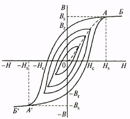 Для достижения полного размагничивания образца к нему необходимо приложить поле определенной напряженности и противоположное по знаку. Напряженность такого поля называют коэрцитивной силой Нс. При дальнейшем возрастании отрицательного поля индукция тоже становится отрицательной и в точке А' при B = — Bs, достигает значения индукции технического насыщения (В = — Bs). После уменьшения отрицательного поля, а затем увеличения положительного поля кривая перемагничивания опишет петлю, называемую предельной петлей магнитного гистерезиса, которая является важной технической характеристикой магнитных материалов.