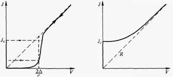 При малых значениях тока напряжение V остается равным нулю. Когда ток превосходит Jс, сверхпроводимость разрушается, и скачком появляется пороговое напряжение Vс, позволяющее туннелировать нормальным электронам. При дальнейшем увеличении тока характеристика становится линейной в силу омического характера одночастичной ветви. Однако при уменьшении тока наблюдается гистерезис, а именно, одночастичная характеристика при уменьшении тока продолжается вплоть до точки J = 0, V = 2∆/e, а затем V скачком обращается в нуль, как это показано на рис. 6.5а.